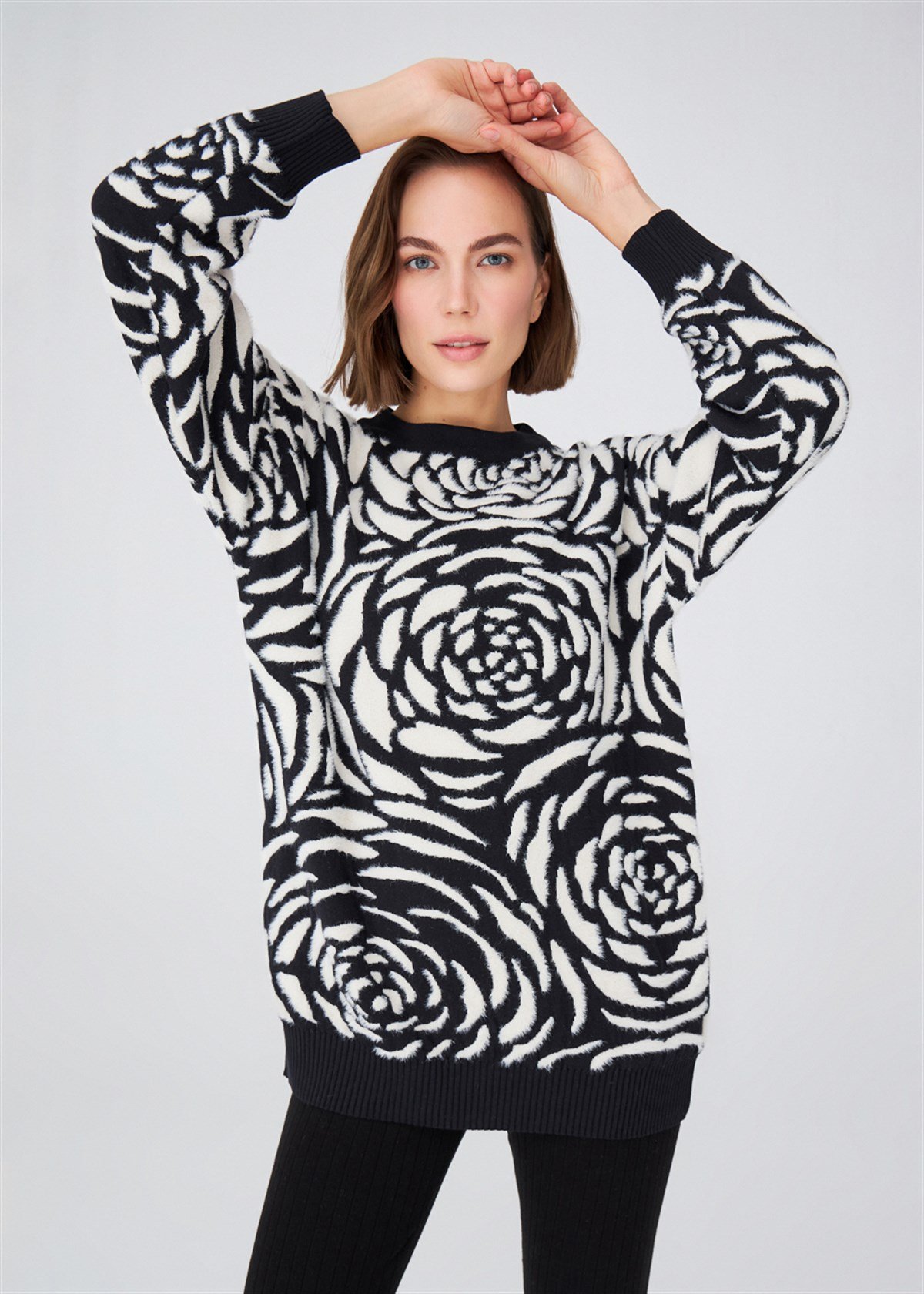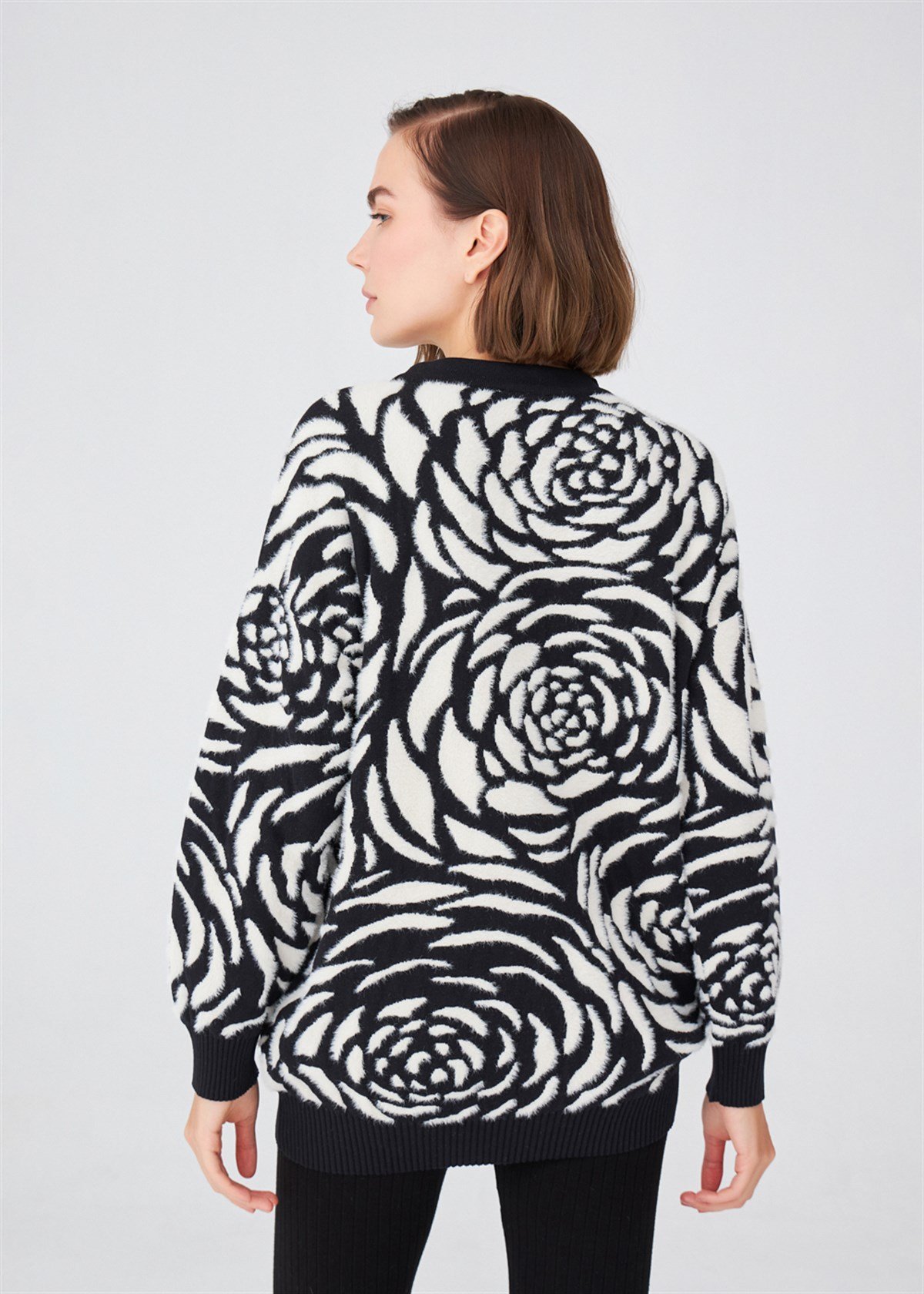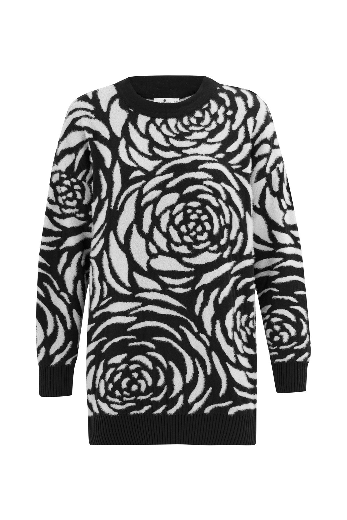 The product on the model is size S/36 Big Rose Pattern Jacquard , Bicycle Collar Tunic Comfortable Fit