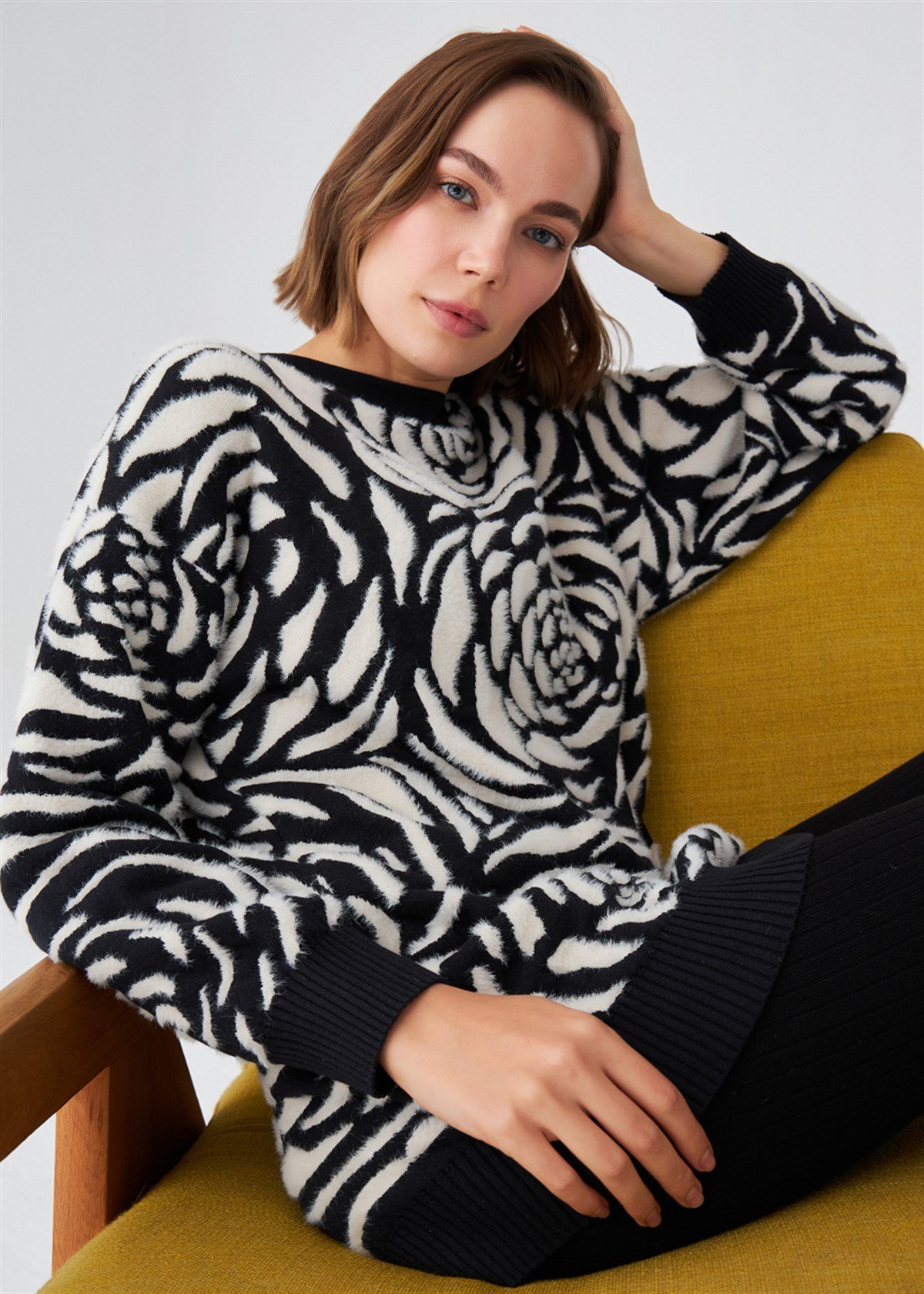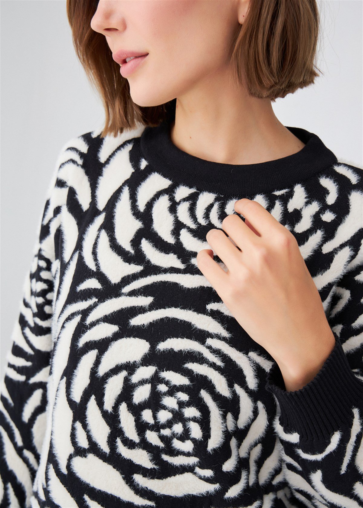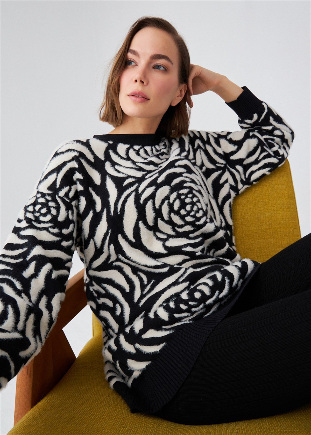 The product on the model is size S/36 Big Rose Pattern Jacquard , Bicycle Collar Tunic Comfortable Fit
