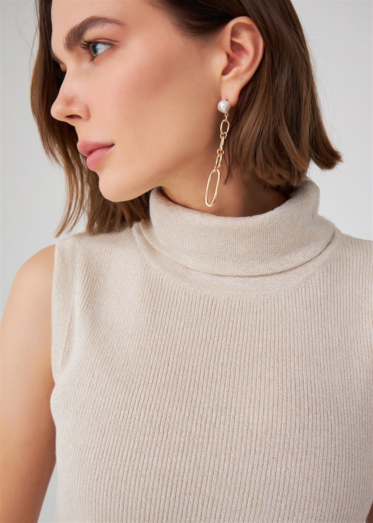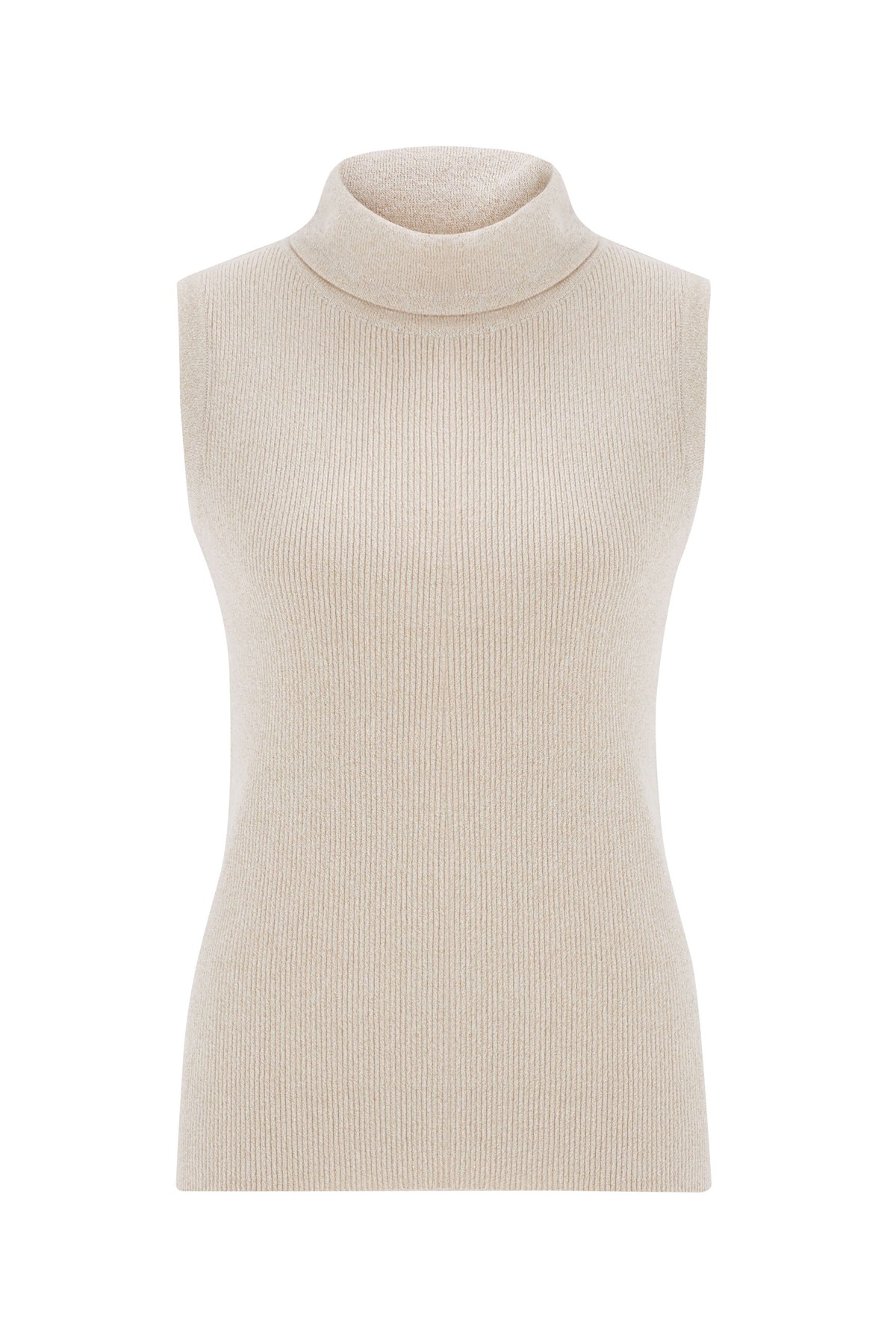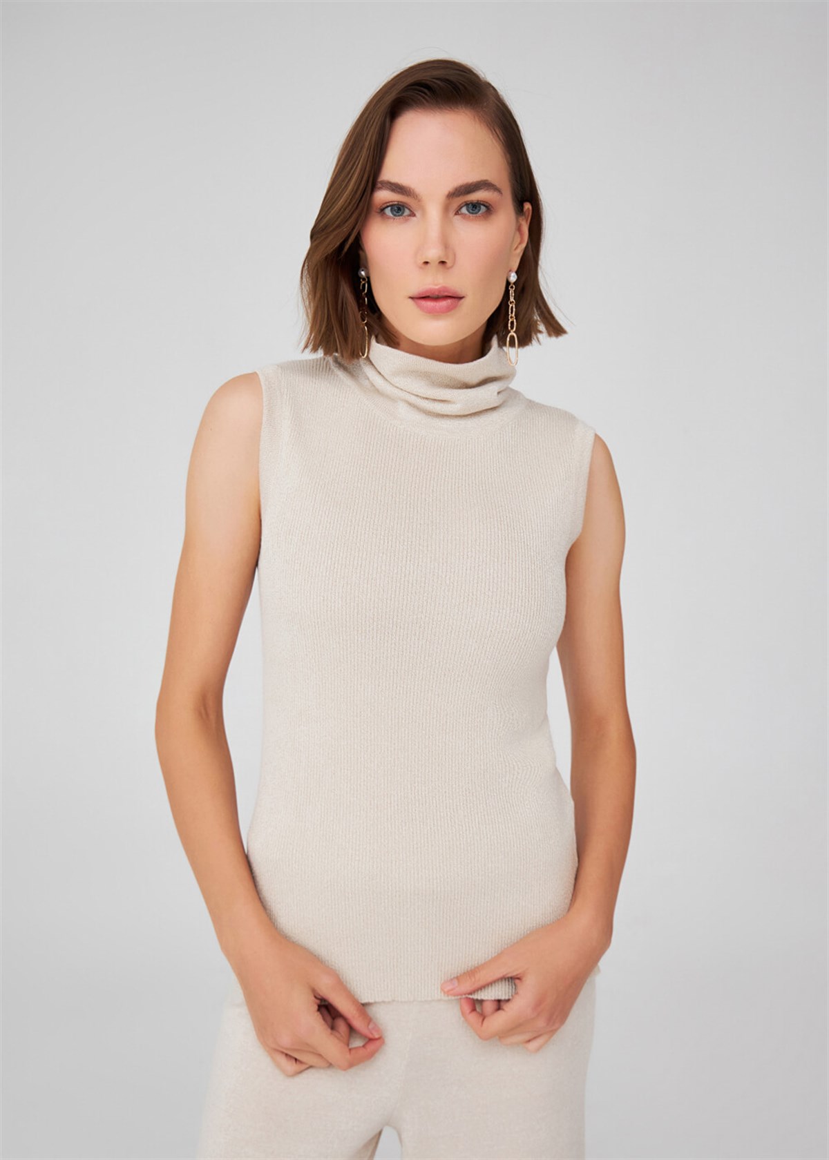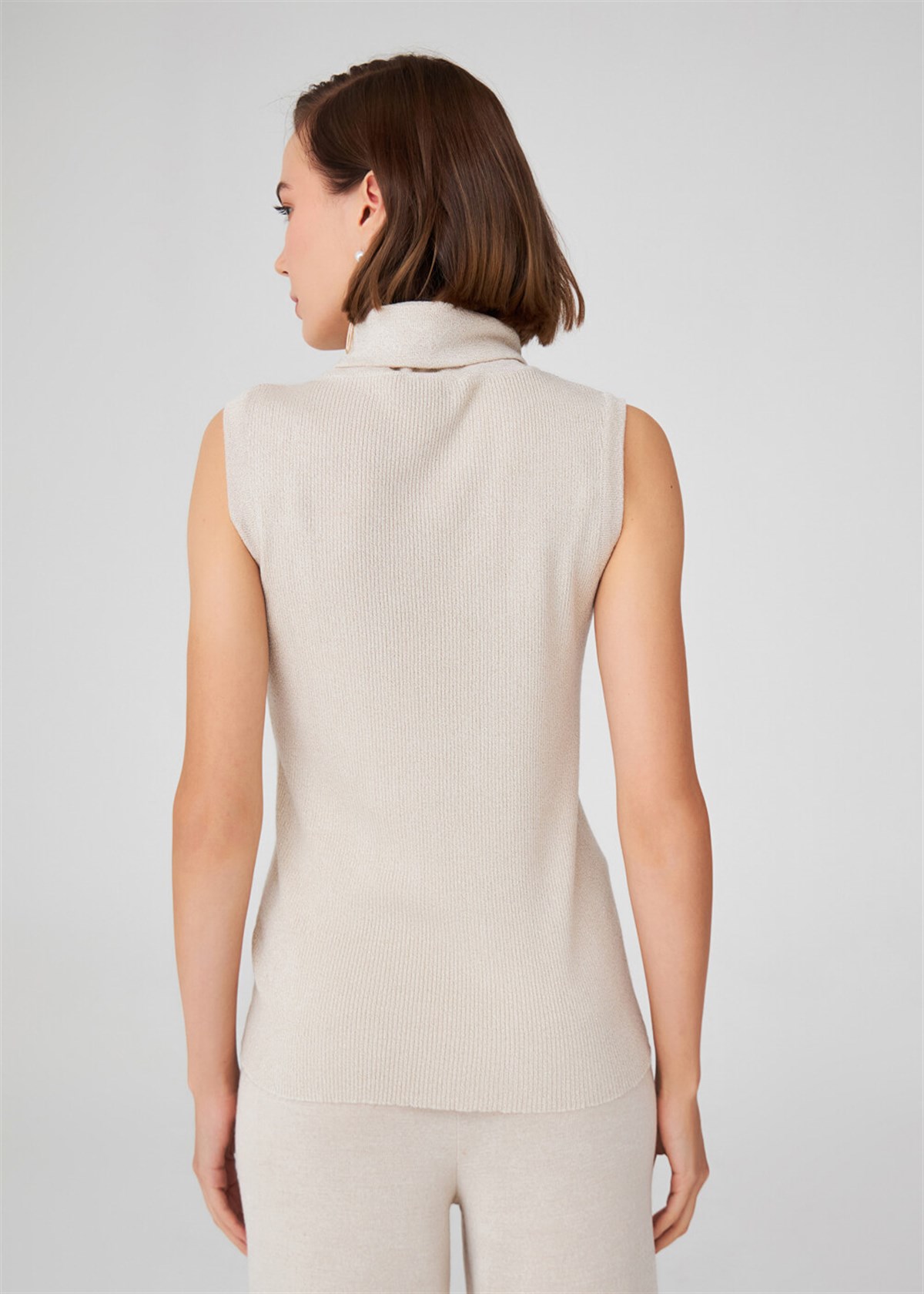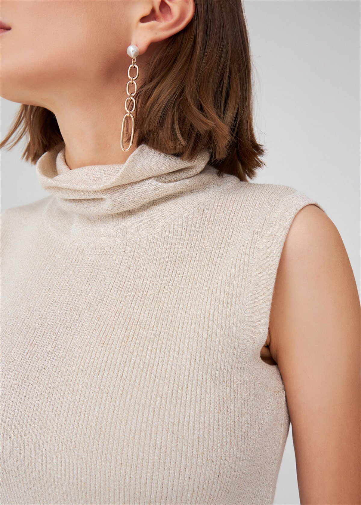 The product on the model is size S/36 Ribbing Braid, Sleeveless, Turtleneck Silvery Blouse Slim Fit