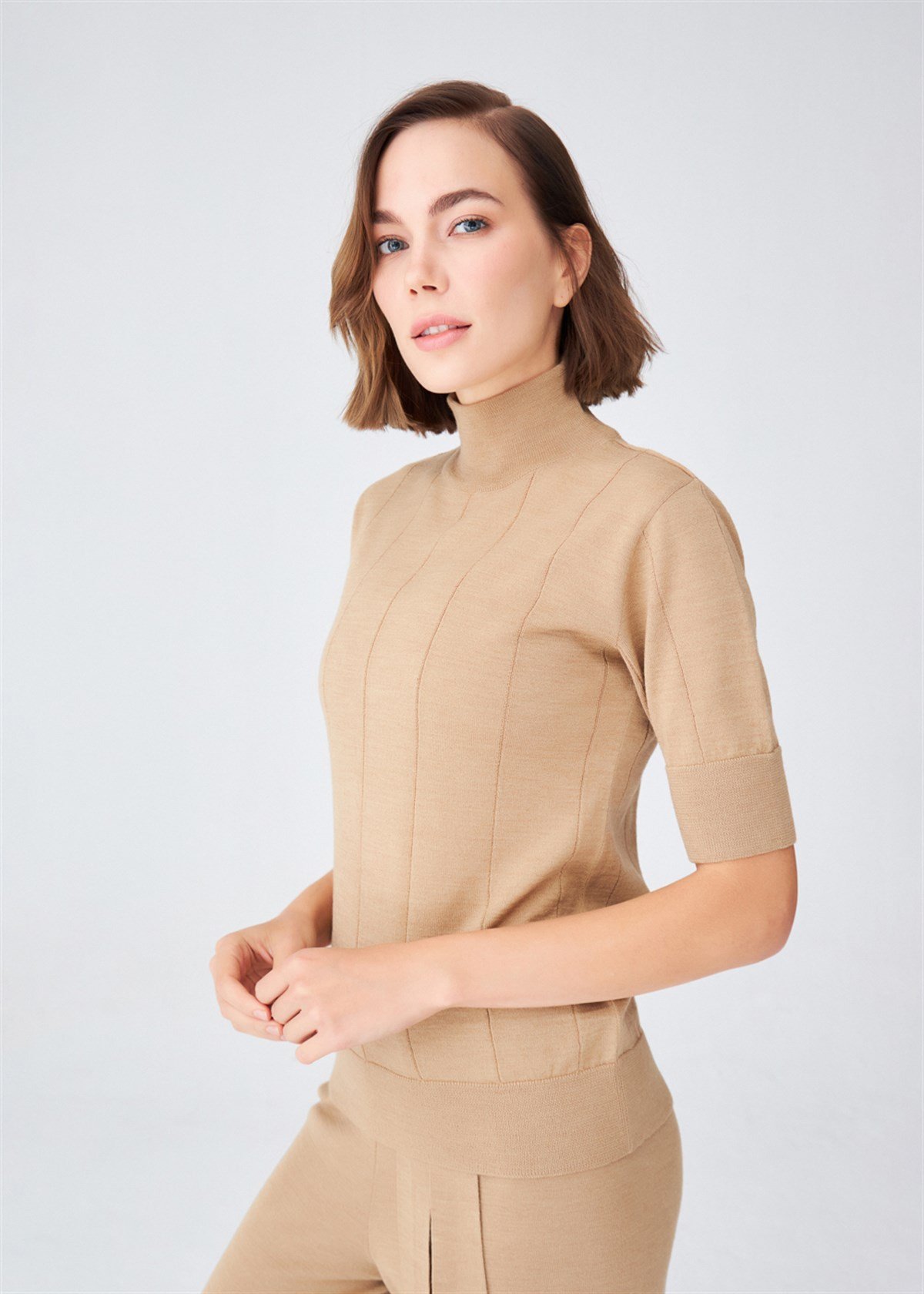 Plain Knitted Rib Detailed, Turtleneck, Short Sleeve Blouse