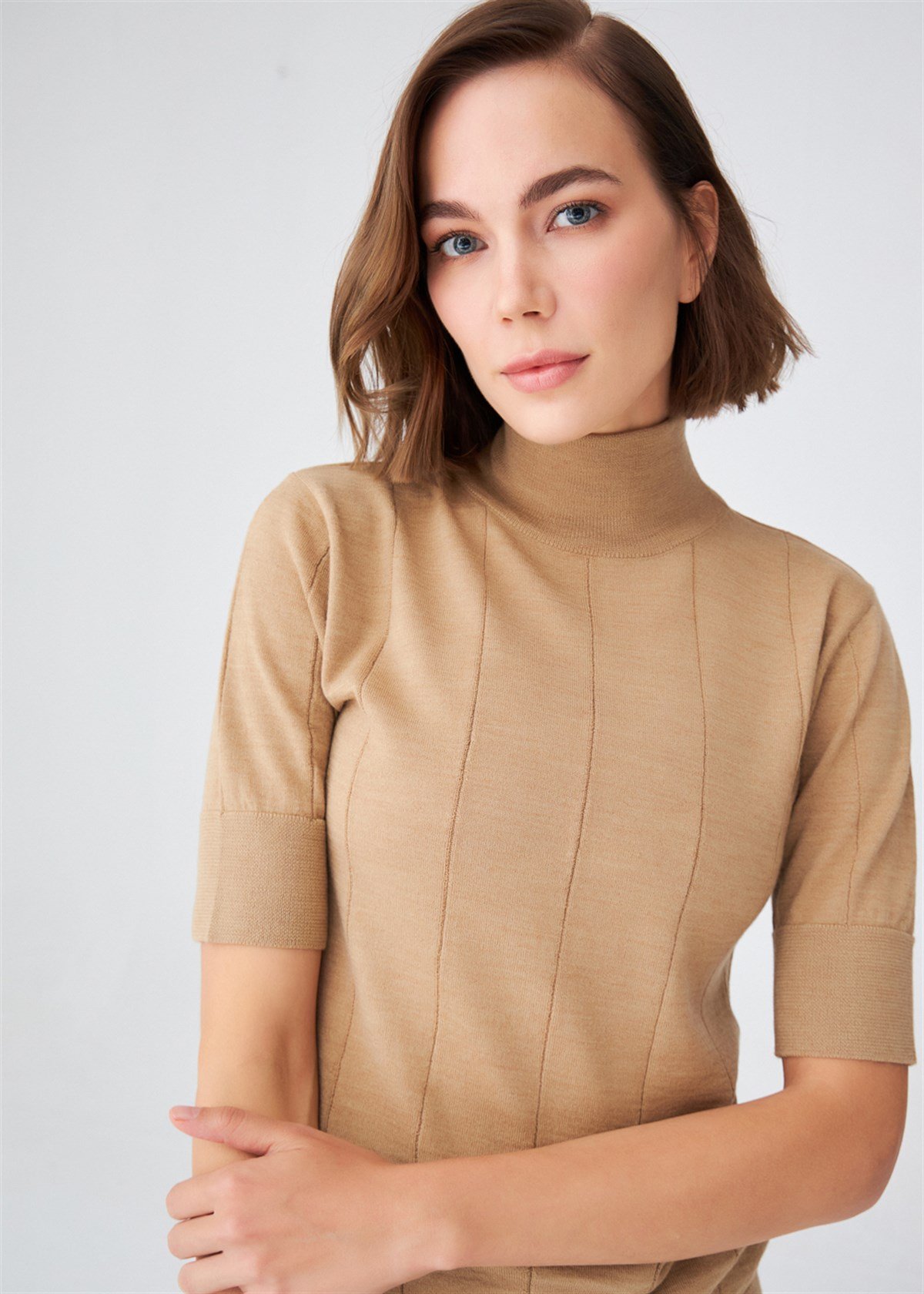 Peraluna Turtleneck Short Sleeve Slim Women's Knitwear Blouse - Camel Melange (12307005)