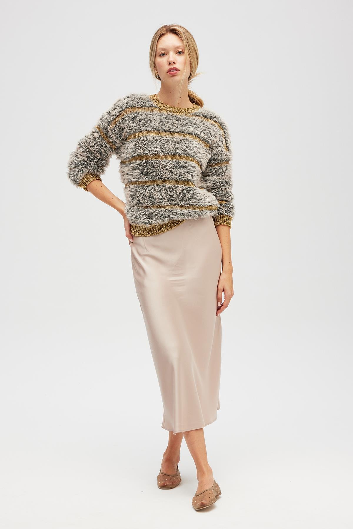 Rahat Kesim, Yumuşak Dokulu, Simli Çizgili, O Yaka Kadın Triko Kazak